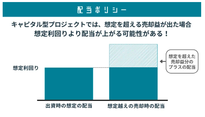 投活では、インカム×キャピタルのハイブリット型の案件が多く、独自の配当ポリシーから、キャピタルゲインの売却益によっては利回りの上振れも期待できます。