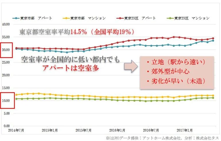 株式会社タスが2018年8月に発表した「賃貸住宅市場レポート」においてアパートとマンションそれぞれの空室率が載っています。