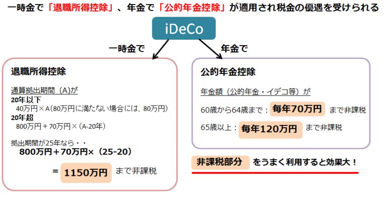 さらに、運用した資産を受け取る時にも「退職所得控除」や「年金控除」で節税メリットが受けられます。