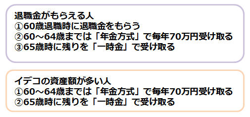 退職金をもらう方は60歳に退職金をもらい、それから4年間 iDeCo(イデコ)を年金として受け取り、残りを一時金として65歳に受け取ると、その分は「退職所得」として扱われます。