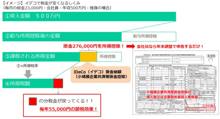 例えば、年収500万円の会社員が毎月23,000円をiDeCo(イデコ)で積み立てた場合、年間で約5万5,500円の節税になります。