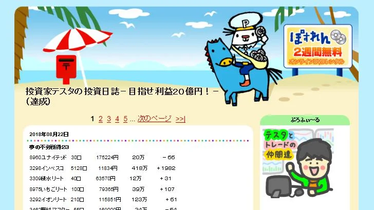 「億トレーダー」として有名な個人投資家テスタさんが、自身で購入した株式の毎月の配当や含み損益の合計を公開しているブログです。