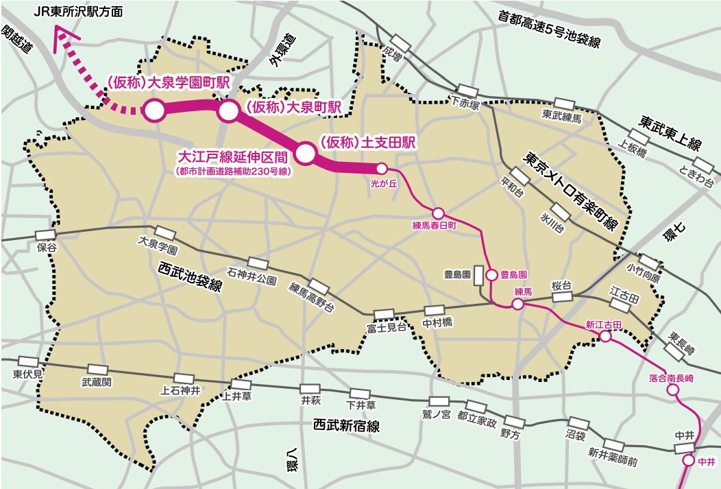 現在の終点である光が丘駅から大泉学園町方面へ延伸し、さらに埼玉県の東所沢駅までつなぐ構想が進められています。この延伸により、練馬区北西部の鉄道空白地域が解消され、都心へのアクセスが向上します。開業時期は2040年頃を目標にした素案がまとめられ、東京都や関係機関が事業化に向けた調整を進めています。