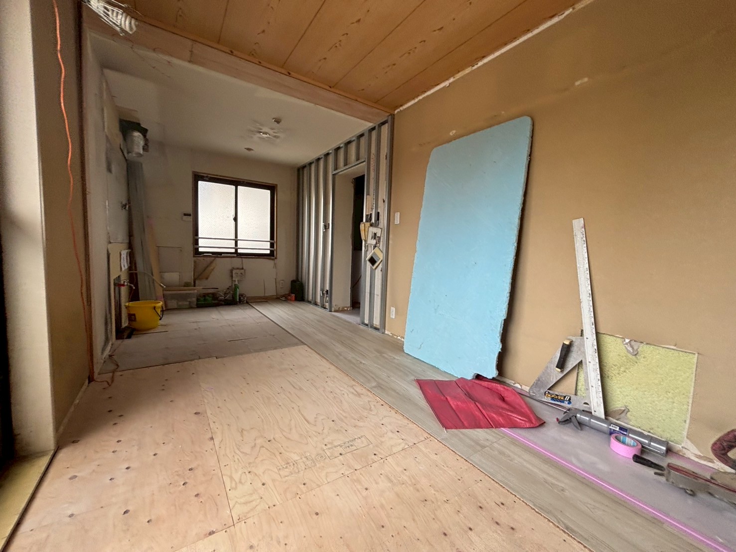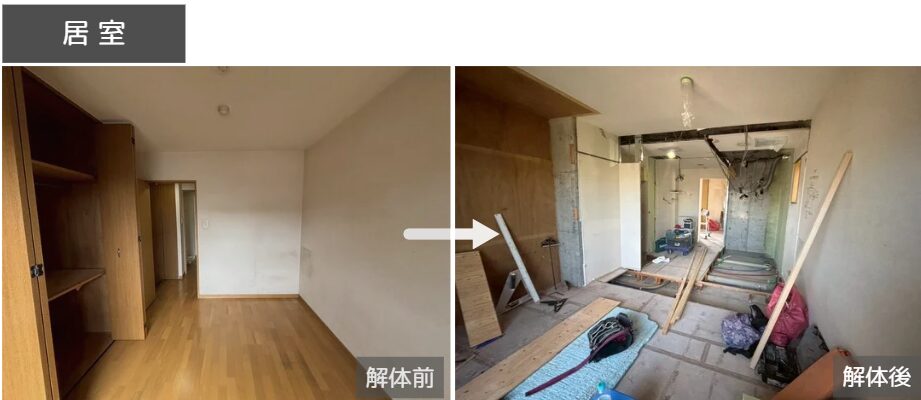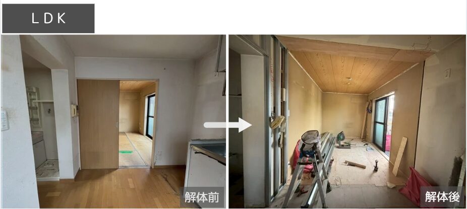LDKへ変更予定の和室は、畳・和天井・仕切り壁の撤去を進めながら、床の高さや仕上げを整えている最中です。段差のない一つながりの空間へと少しずつ形を整えています。