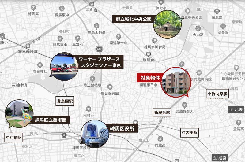 物件最寄りの小竹向原駅は、繁華街の池袋駅に近いものの、駅から少し歩くと静かで落ち着いた住宅街が広がります。周辺には日本大学芸術学部や武蔵野音楽大学、武蔵大学があり、ファミリー層だけでなく学生も多く暮らす街です。