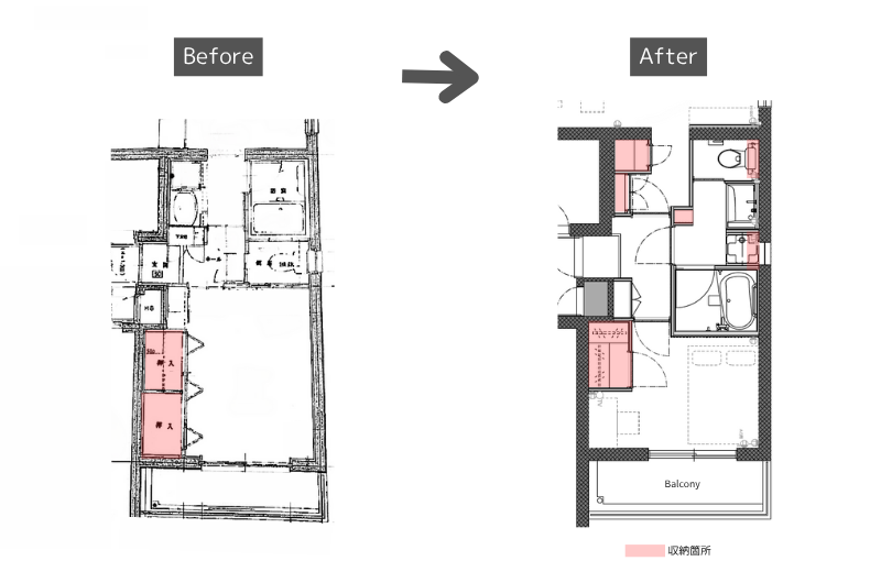 コンパクトだった水回りを一列に集約し、居室スペースを調整することで効率的な間取りを実現します。さらに、従来の洗面台スペースを収納へと活用し、LDKや洗面室の収納力を向上させ、機能性と快適さを兼ね備えた住まいへと仕上げます。