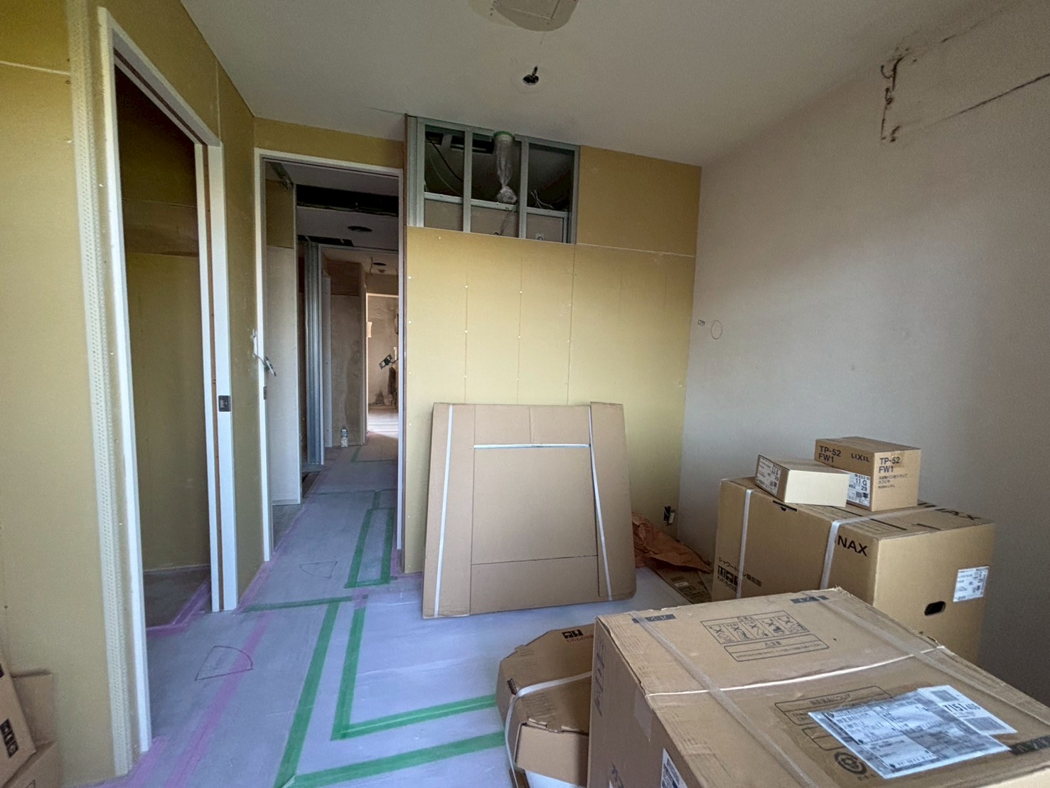 一部の壁や天井は既存のまま使用するため、解体工事と施工工事が並行して進められています。