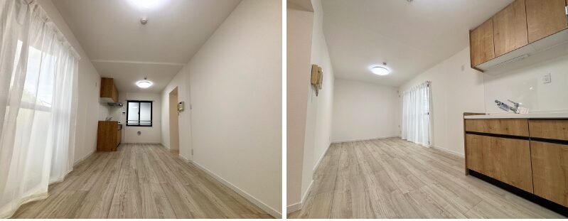 ターゲットとなる一人暮らしや二人暮らしのライフスタイルに合わせ、ゆとりあるリビング空間を実現するため、2DKの間取りを1LDKへとリノベーションし、現代のライフスタイルに適した間取りへと進化させます。