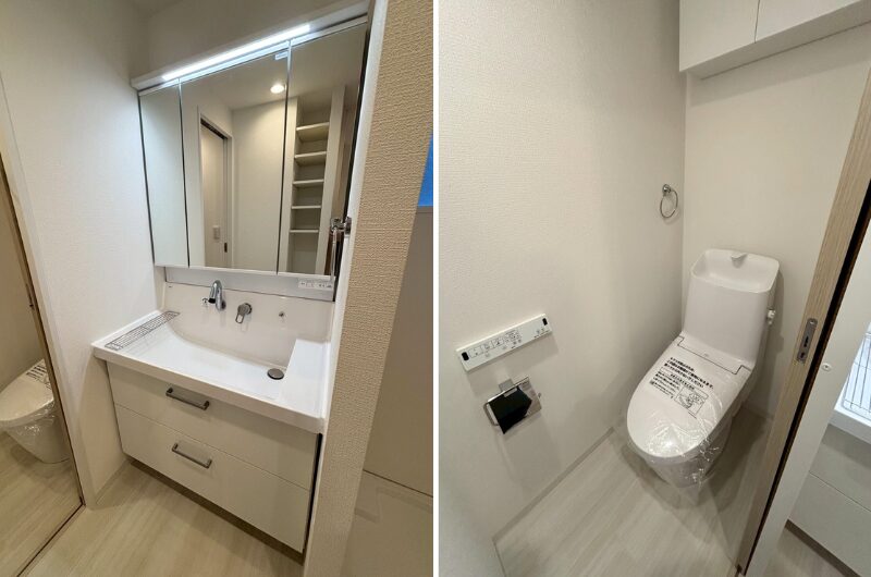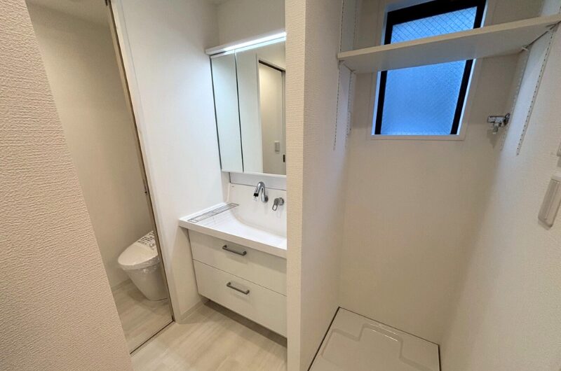 明るい色で統一した水回りを一列に配置し、動線がスムーズで見た目もすっきりとした空間を実現しました。洗面室にはFIX窓があることで、自然光が差し込む明るく清々しい印象に。