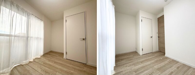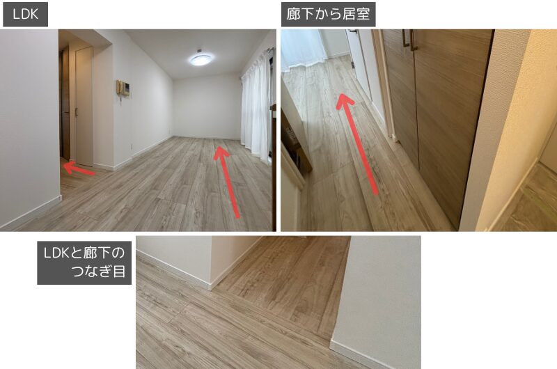 基本的には部屋の長手方向と平行に貼ることで、すっきりと違和感のない空間が生まれます。そのためLDKは長手方向に貼りました。