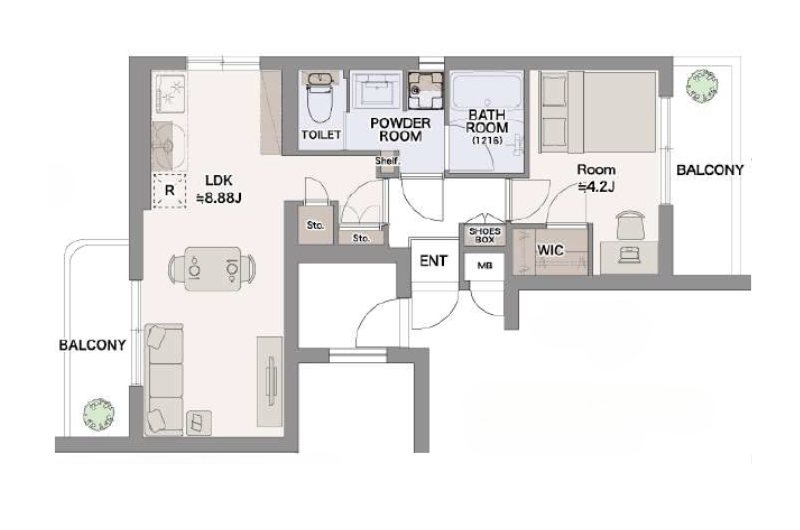 バルコニーが2方向にあり、LDKと居室は廊下を挟んで独立しています。プライベート空間と日常の空間を無理なく分けられる設計です。