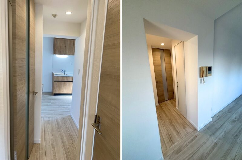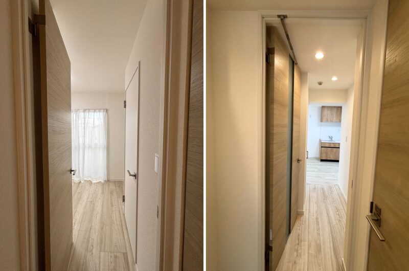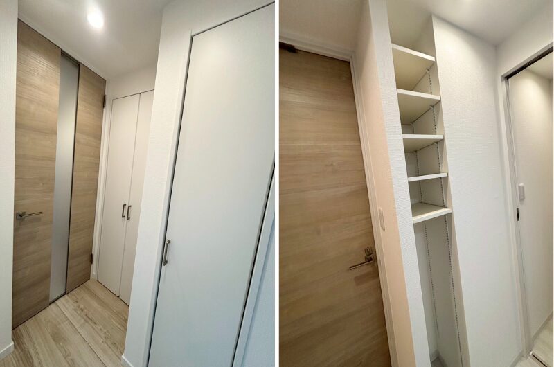 さらに、玄関からLDKへ続く廊下には、扉の開閉スペースに合わせて大きさを変えた収納を設けました。これにより、リビングやキッチンの収納としても活用できるため、物が散らからずスッキリ。ライフスタイルや持ち物の量によっては、新たに家具を置かずに済み、居室やLDKをより広く活用できます。