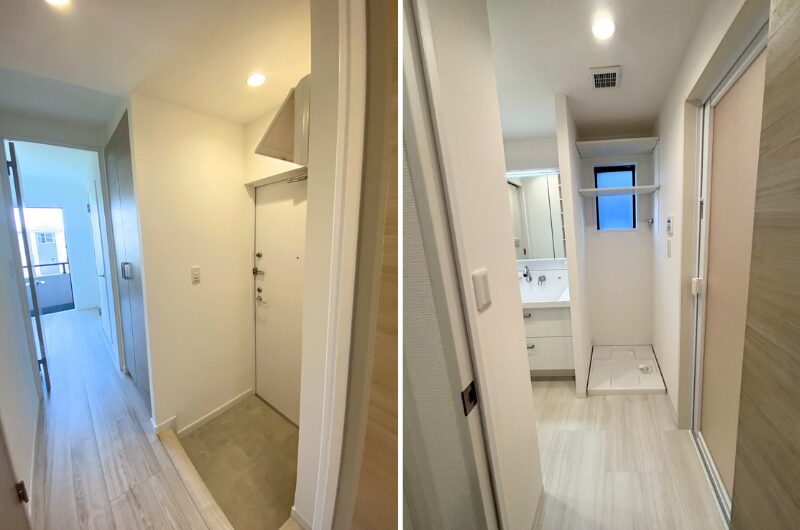 玄関を入るとすぐに洗面室があり、FIX窓からの光が空間に広がり、爽やかで快適な印象を与えます。