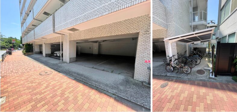 1階部分には店舗とゆとりある駐車場があり、建物横には屋根付きの駐輪場も完備されています。