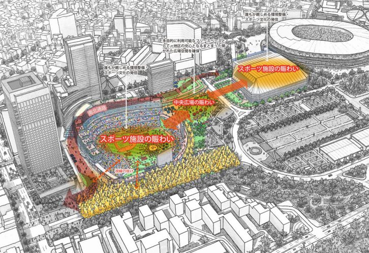 神宮外苑では、これからの100年に向けて緑豊かなスポーツの拠点を目指し、再開発が進行中です。明治神宮球場や秩父宮ラグビー場の老朽化、バリアフリーや回遊性の課題に対応するとともに、施設整備と調和する形で「みどりの散策路」を南北に整備します。既存樹木の保全と育成環境の改善、さらには新たな樹林地の創出により、自然と都市が共生する景観を形成していきます。