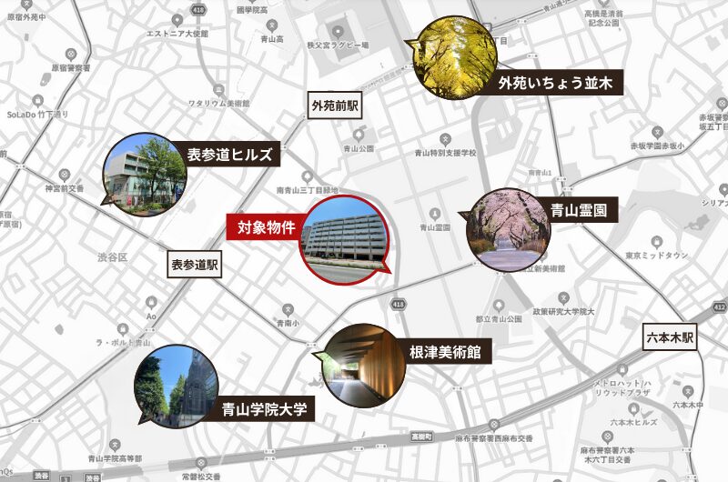 交通:東京メトロ銀座線「外苑前」駅徒歩7分/東京メトロ銀座線・千代田線・半蔵門線「表参道」駅徒歩12分