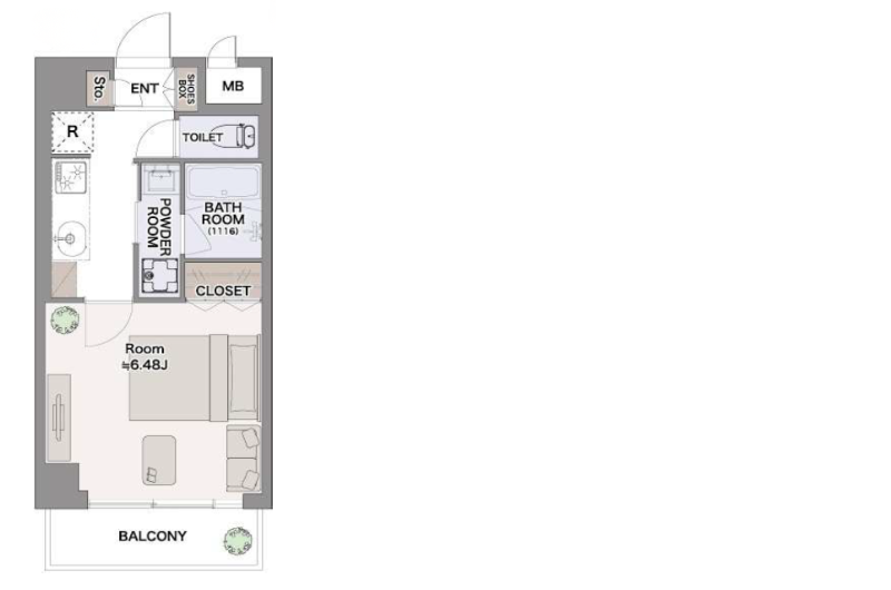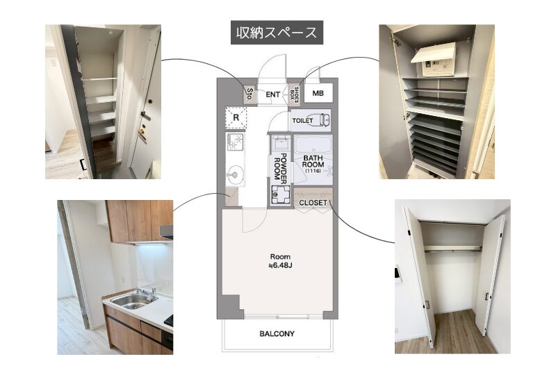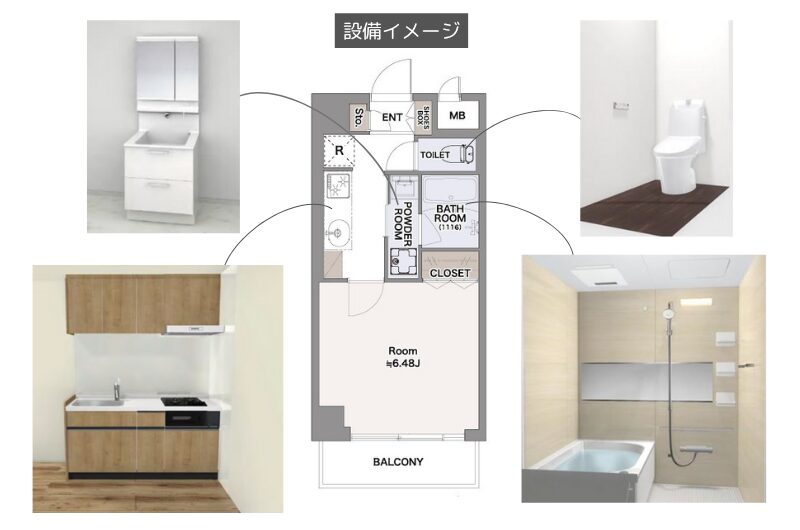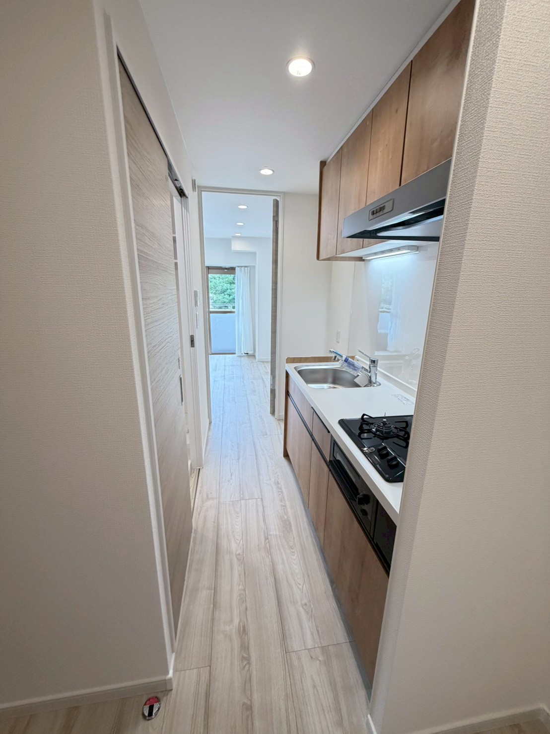 1Kという間取りの特性上、玄関からキッチンが見える配置ですが、木目調のキッチンが自然な温もりと落ち着きを演出します。賃貸の1Kとは異なり、定住に適した収納スペースを確保。キッチン用品が多くても対応できるよう、収納棚を設置できるスペースを備えています。