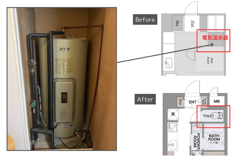 今回、ガス給湯器へ変更することで、バスとトイレを分離したリノベーションが可能となり、住環境の改善につながります。