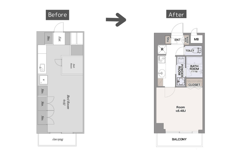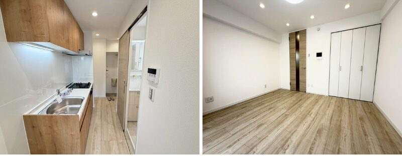 築年数の経過した1Rを、居室とキッチンを分けた1Kタイプへリノベーション。限られた空間にメリハリが生まれ、過ごしやすさが向上します。
