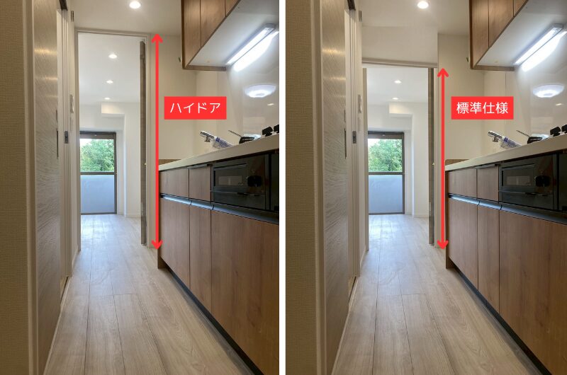 また、室内の扉は、天井高と床をめいっぱい活かした特注のハイドアを採用しました。ドアまわりがすっきりとし、今回のコンパクトな空間に開放感を生み出しています。