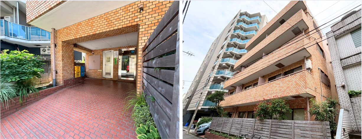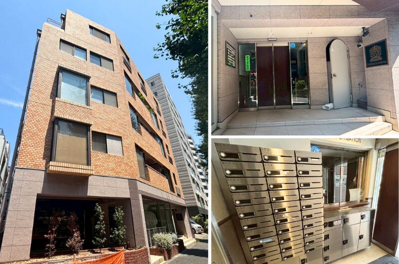 六本木通りに面したレンガ色タイル貼りの外観が印象的なマンション。どこか懐かしさを感じる外観ながら、オートロックや防犯カメラ、宅配ボックスなど、現代の暮らしに嬉しい設備がしっかり整っています。