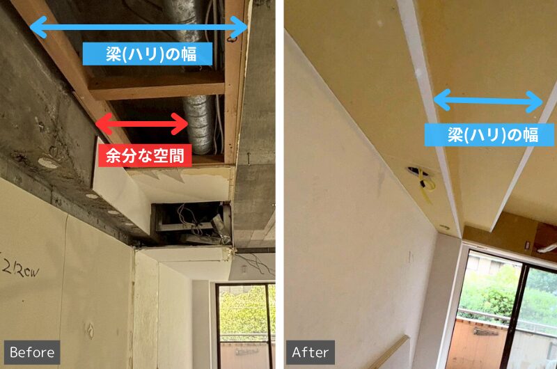 解体前の部屋もリノベーションされており、配管ダクトの位置に合わせて造作していたため、梁(ハリ)の幅が大きく取られていました。今回はその幅を最小限に調整します。