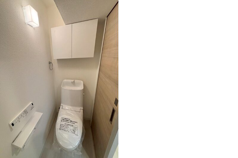 洗面台横のサイドキャビネットは、浴室と共通の配管ルートに合わせて左側へ配置。配管の勾配を最適に保ちながら、日用品を取り出しやすい実用的な収納となっています。