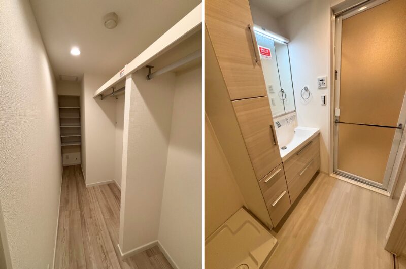 縦長の形状を活かしたウォークインクローゼットを作る際、床上げや天井下がりが重なることで狭くなることを懸念していました。しかし最終的には十分な幅を確保でき、想像以上に歩きやすく、使い勝手の良い空間に仕上がりました。個人的にも、ここはとても満足度の高い仕上がりになったポイントです。