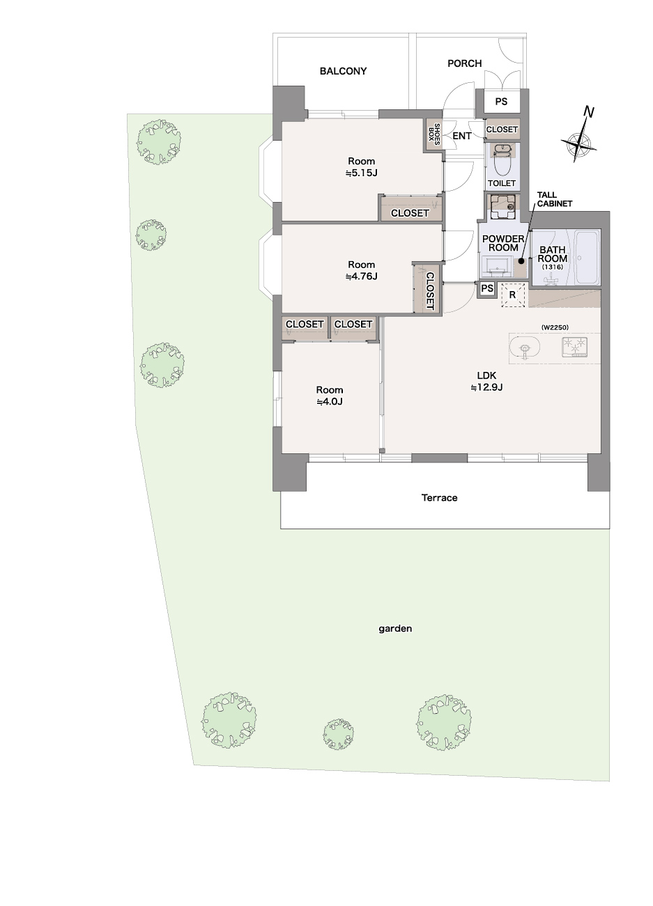 梁がある部分は天井が低くなるため、梁が見えている部分があると圧迫感が出やすくなります。これは間取りを工夫することで可能な限り梁を隠します。具体的には、各部屋の収納場所を梁に合わせて配置することで、視覚的に梁を見えなくします。バスルームも梁を避けて天井の高い状態にします。