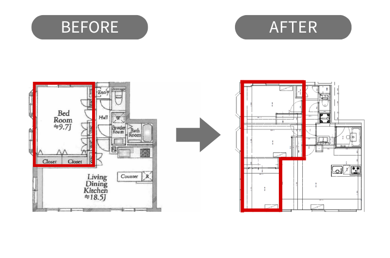 ✓居室を3つに増やしてファミリー向けの物件に変わる