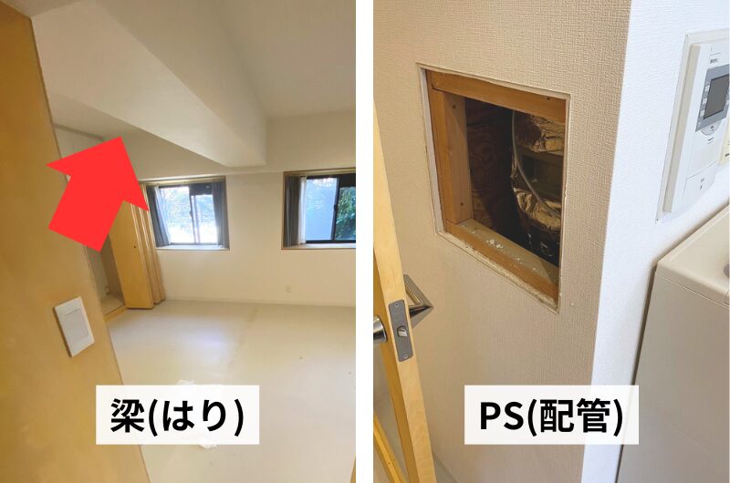 物件から取り除くことができない「梁(はり)」と「PS(配管)」。これらによる圧迫感が生まれないように工夫をします。