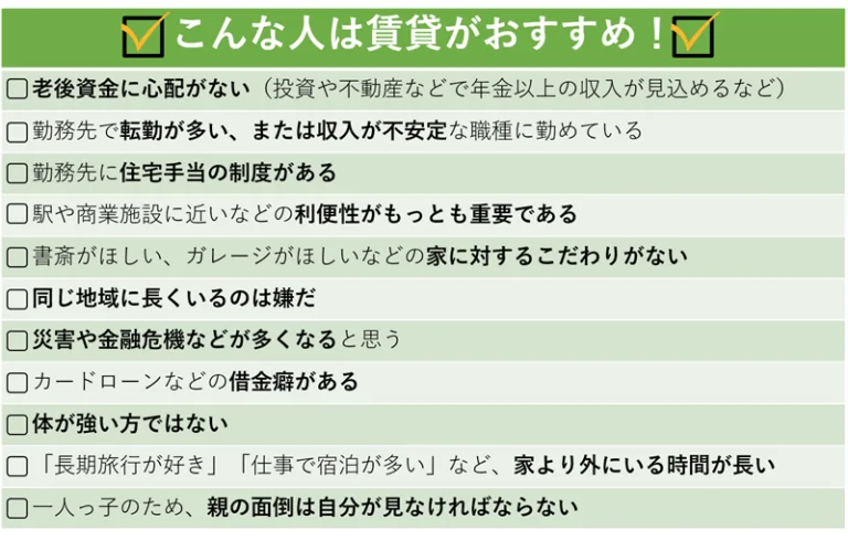 「こんな特徴のある方は賃貸向き」という内容をチェックリストにまとめましたので、参考にしてみてください。
