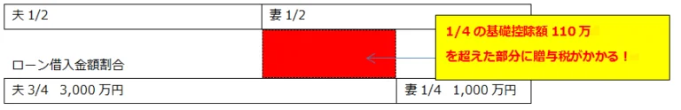 ローン借入が夫3/4、妻1/4の場合でも、上記の持分割合では税務上「妻は自分の1,000万円と夫からもらった1,000万円の合計2,000万円でマイホームを購入した」とみなされます。