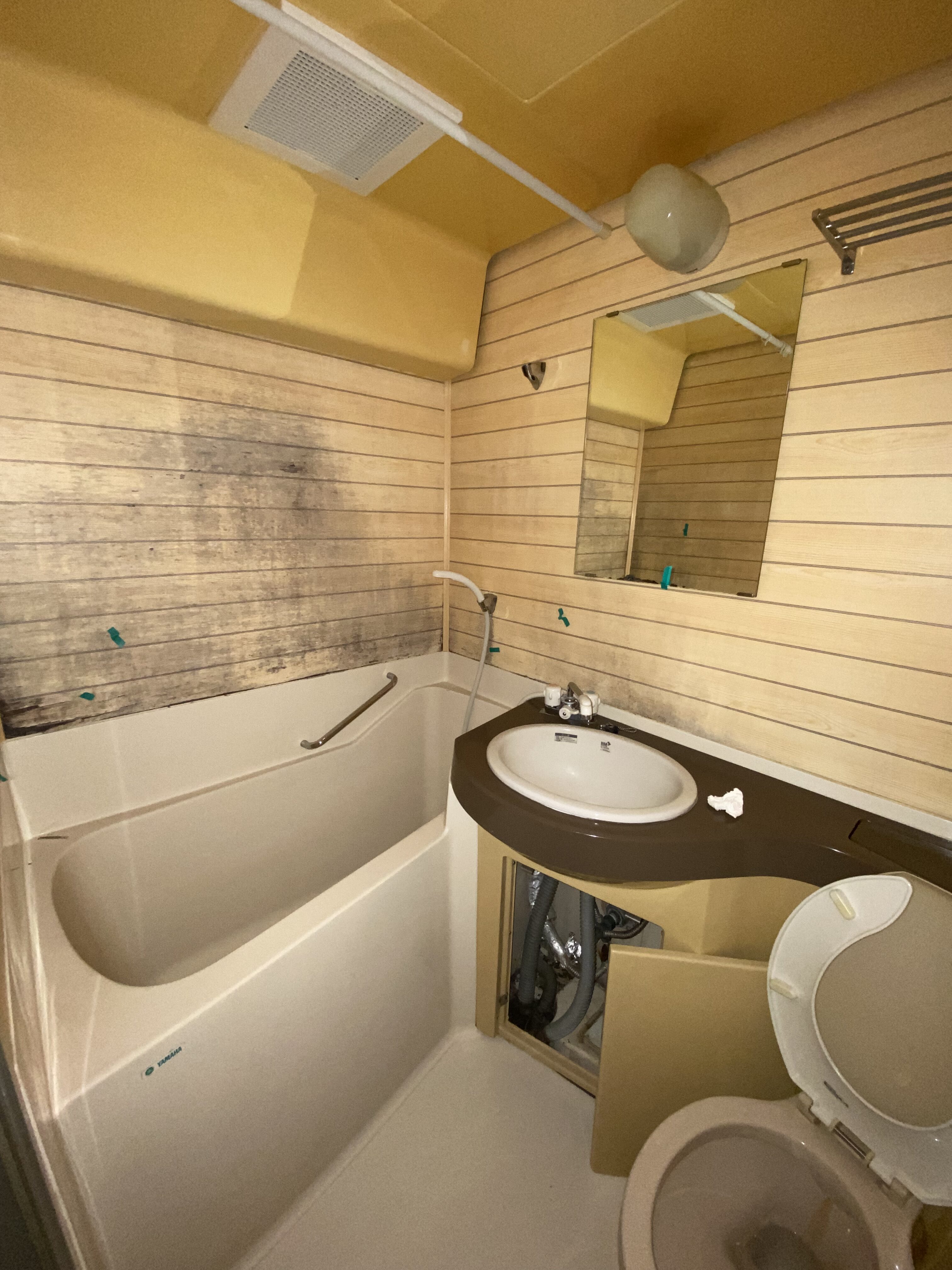 黄色基調の天井に木製の壁。カビによる変色が目立ちます。