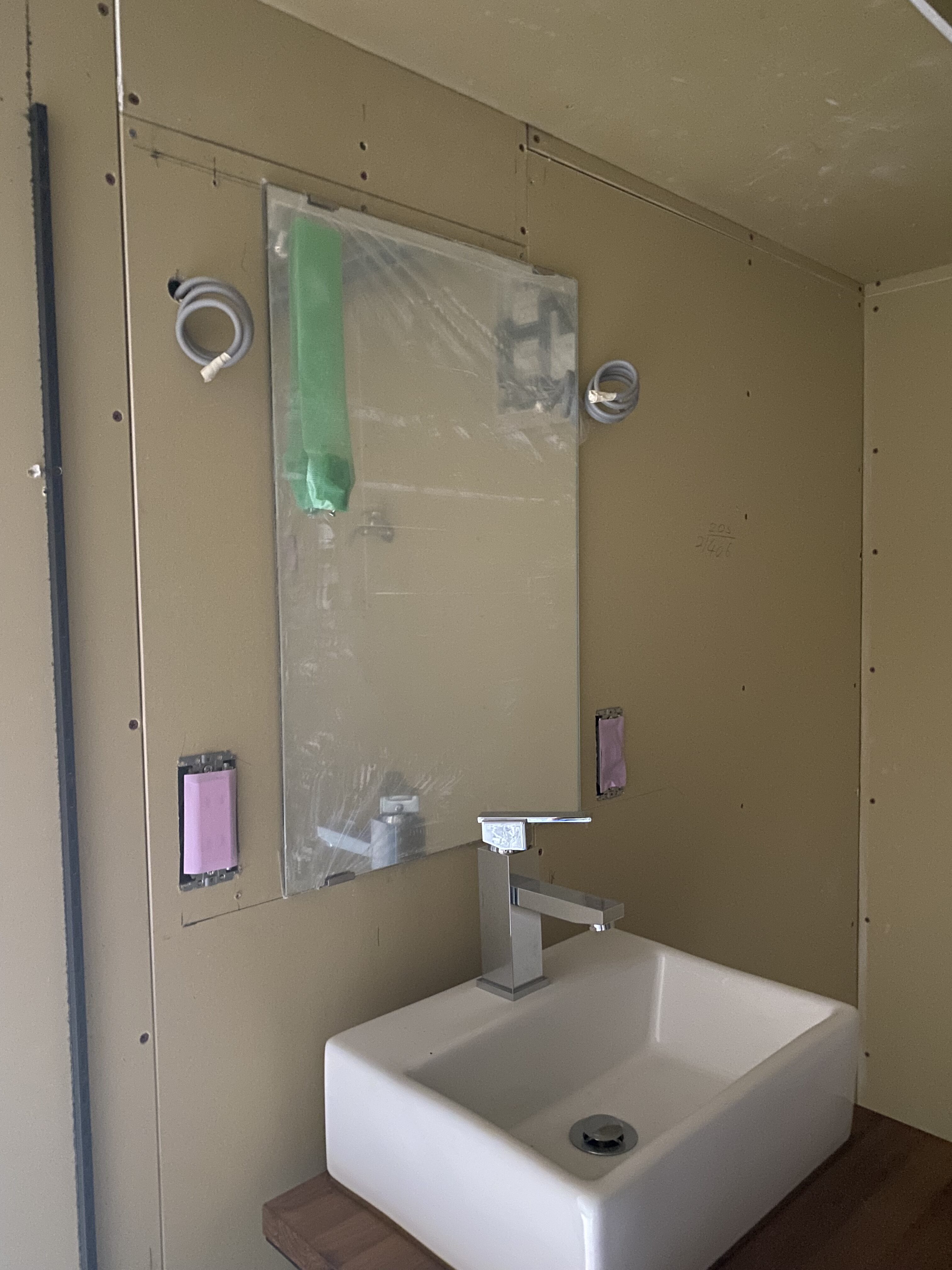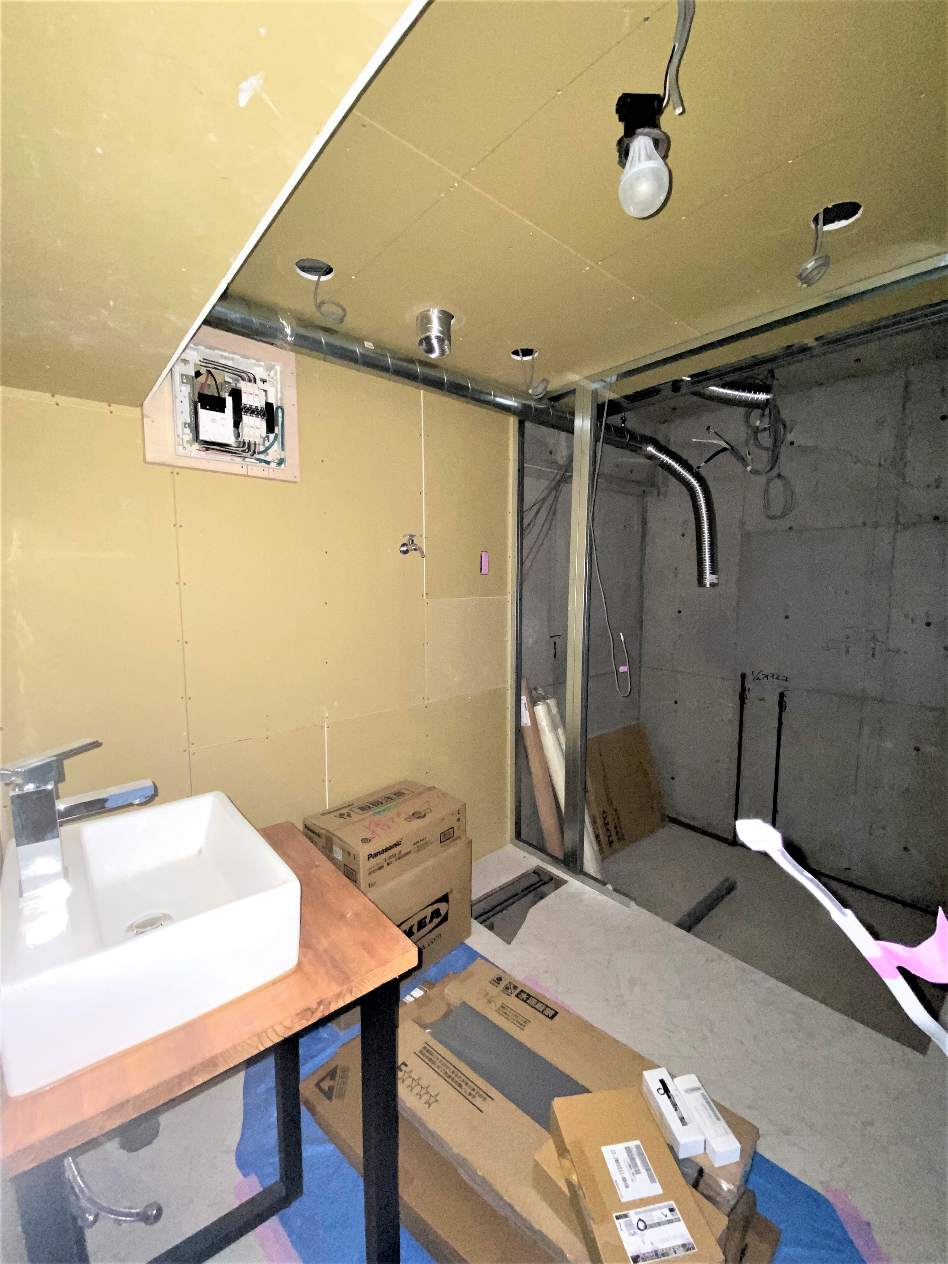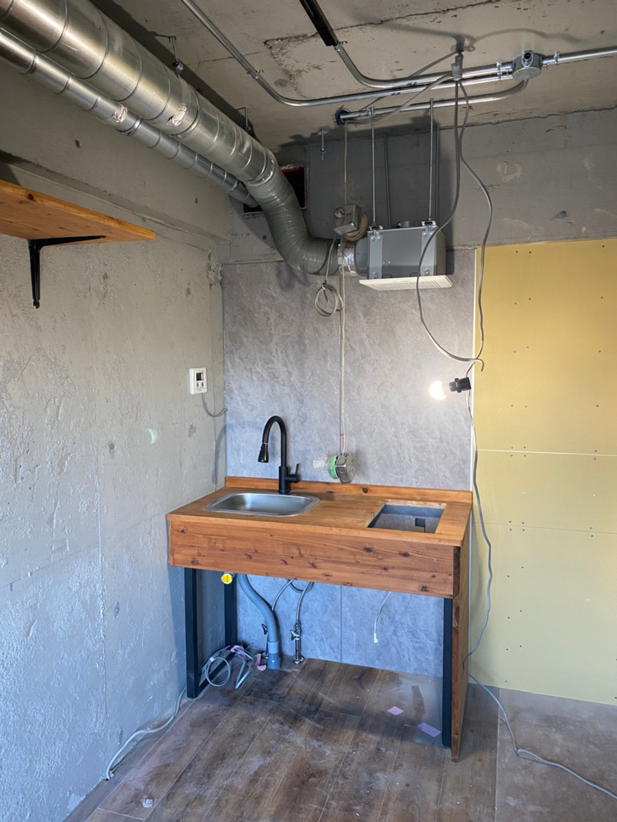 キッチンの換気扇の配管が設置され、洗面所との境にも壁が設置されました。