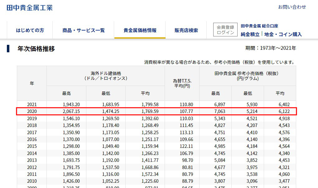 参考:田中貴金属工業年次価格推移より