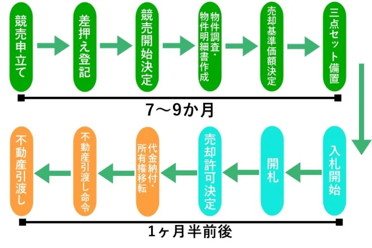 不動産競売が実際にどのような流れで行われるのかが、一目で分かりますので確認しておきましょう。