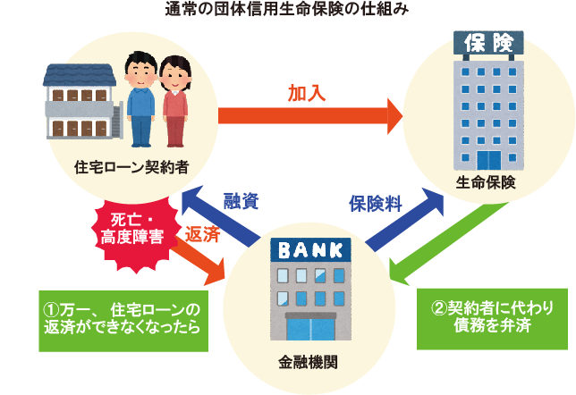 団体信用生命保険(通称「団信」)は、住宅ローンや不動産投資ローンの返済途中で死亡または高度障害になった場合に、本人に代わって生命保険会社が、住宅ローン等の残高を支払うというものです。
