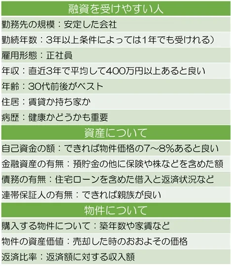 大きく分けると「収入を含めたその人自身について」「預貯金や資産の有無」「購入する物件の収益性」という3つで融資するかどうかが決まると言って良いでしょう。