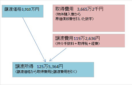 つまり、譲渡価額の3910万円から取得費である3665万2000円と譲渡費用である119万2636円を引き、合計の125万5364円が譲渡所得になります。