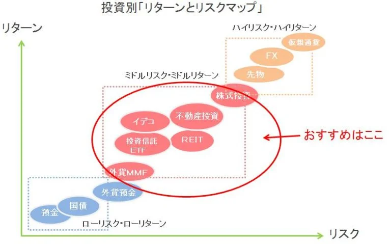 下記の図は、リスクとリターンからみた投資商品の立ち位置を表しています。