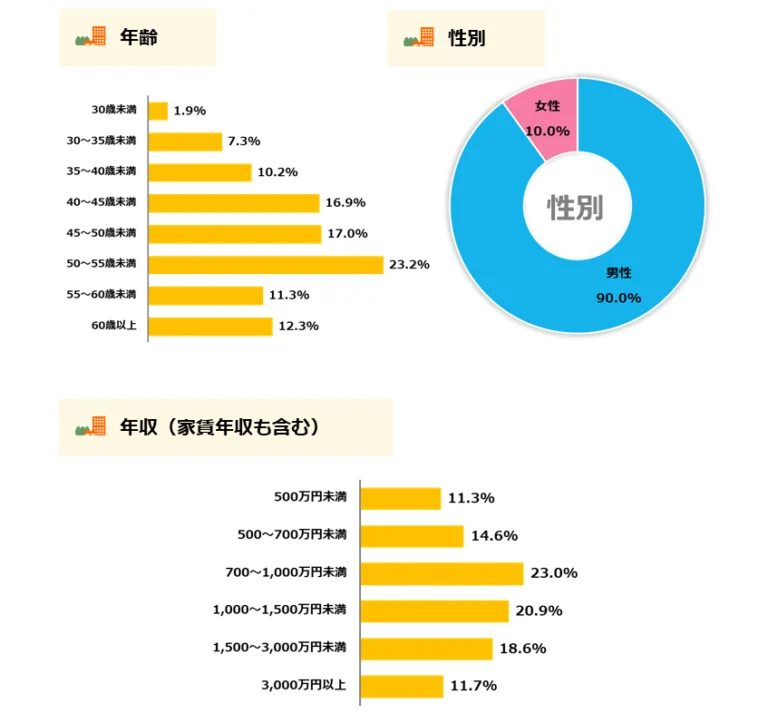 不動産情報サイト「健美家(けんびや)」で会員向けに実施しているアンケート調査の回答者の属性について、このような結果が公開されています。