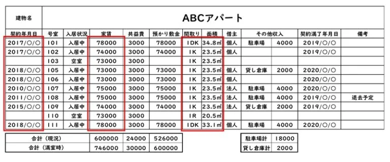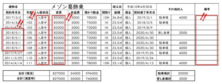 そこで、先ほどのレントロール例を基に、最低限チェックしておくべきポイントをまとめましたのでご覧ください。