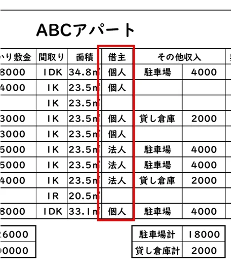 属性と言っても「個人か法人か」が分かればよいのですが、稀にアパート一棟を丸ごと法人が借り上げていることがあります。