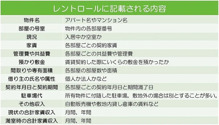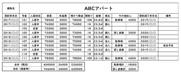 しかしレントロールは不動産投資家だけでなく、管理会社が保管する情報として、または資産価値の評価で使用することもあり、最低限記載すべき内容は大体決まっています。