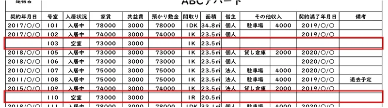 レントロールは誰でも作れてしまいますので、空室なのに「入居中」と書いている場合があります。