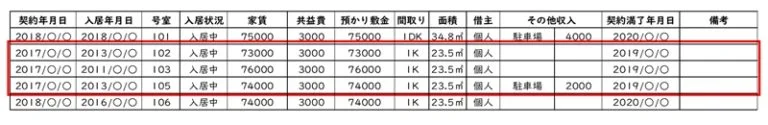 つまり、上図の例であれば真ん中の3部屋は次の年に家賃交渉が入る、若しくは退去の可能性があるという風に予想できるのです。