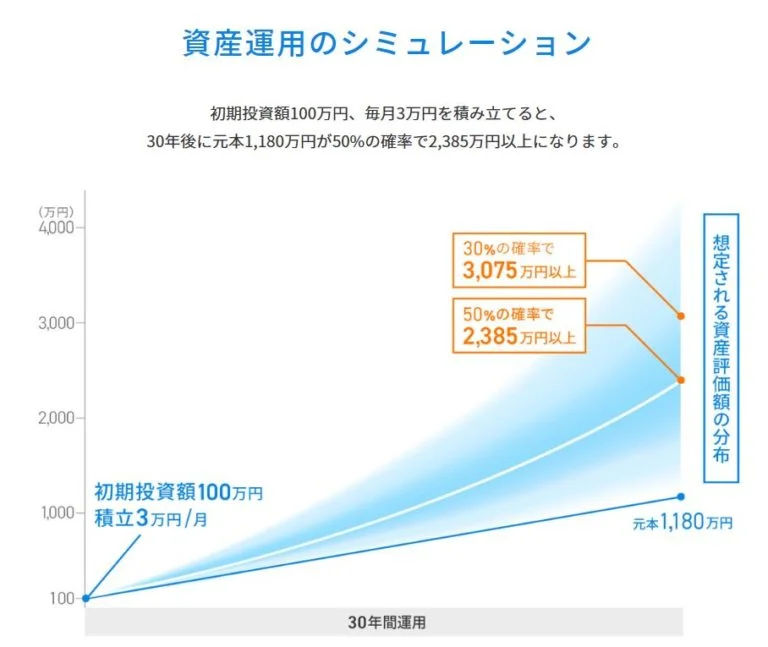 ロボアドバイザーのシミュレーションでは、以下のように30年後、元本が2倍以上になる可能性も示してます!