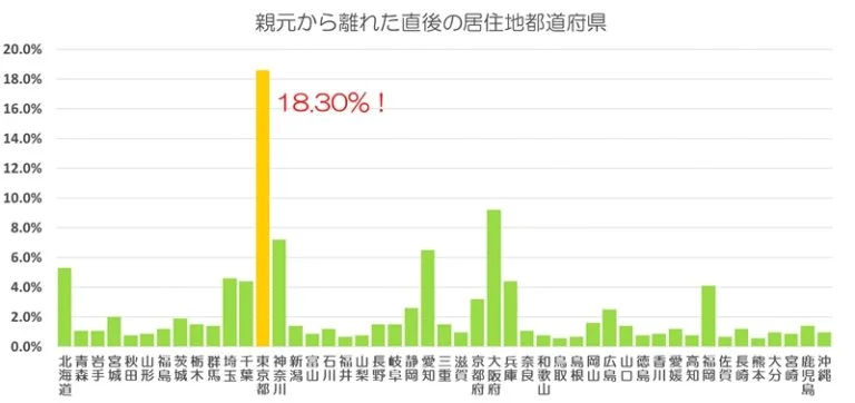 上のグラフは「親元から離れた直後の居住地都道府県」という一人暮らしを始める時の引越し先の割合を表したものです。