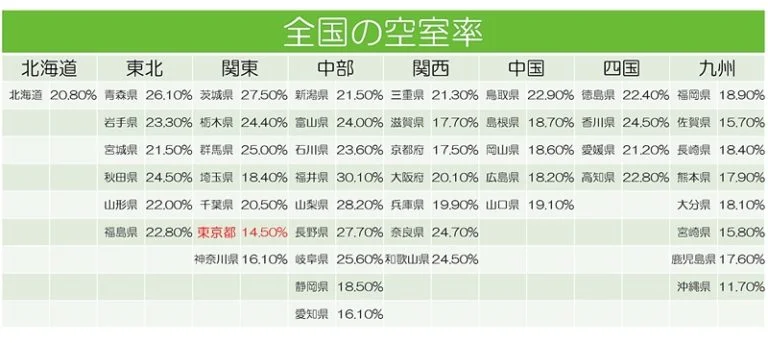 また、以下の表でもお分かりいただけるとおり、他の都道府県と比べて東京都の空室率は圧倒的に低いことは明らか。